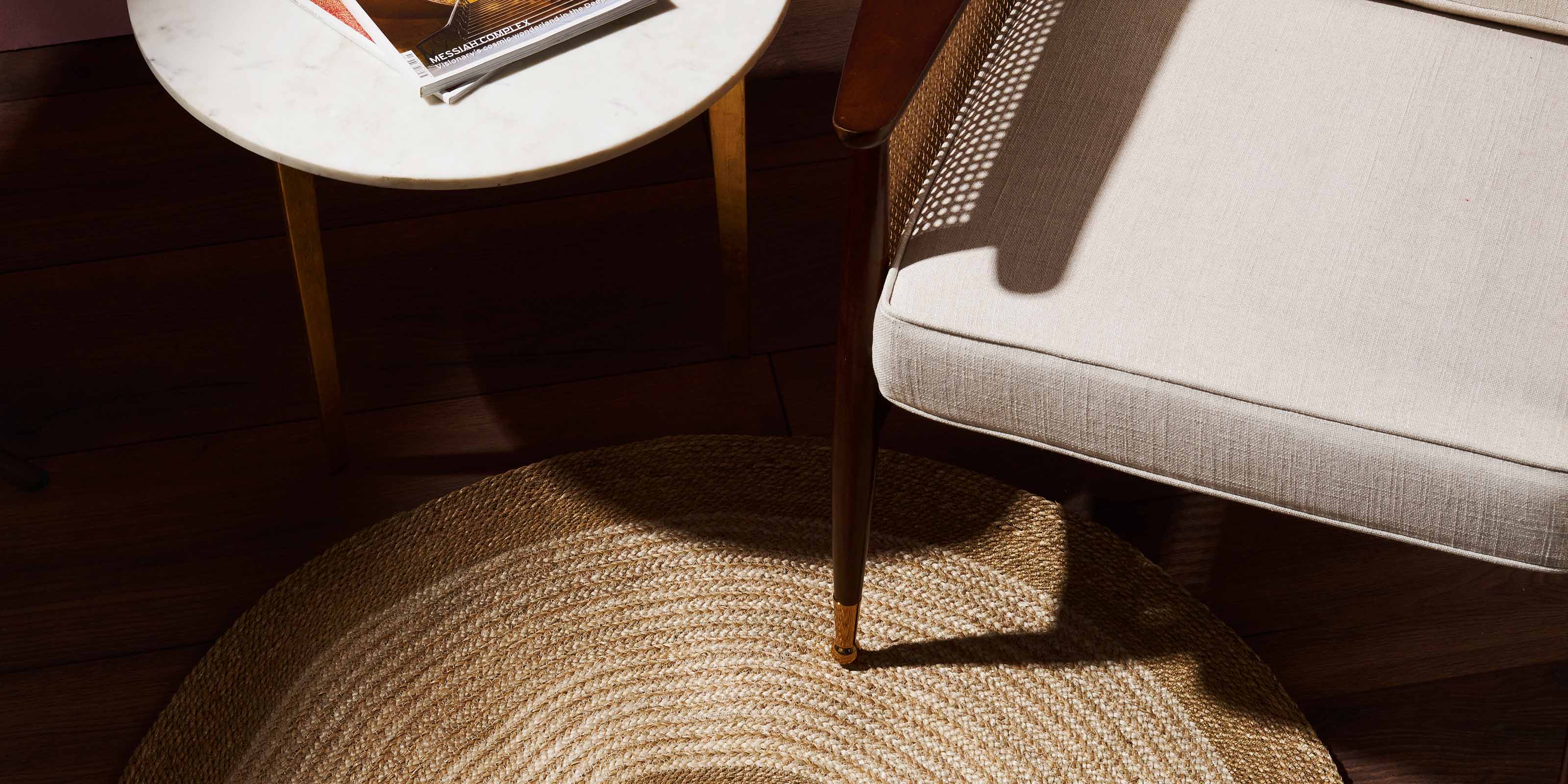 The Rajbari rug is handcrafted with organic jute and mela grass in a striking ring pattern, adding warmth and natural texture to any home.